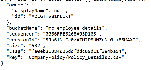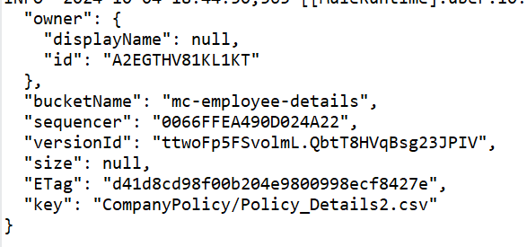 - The response may include metadata about the deleted object, such as its key and bucket name, to confirm which file was deleted.