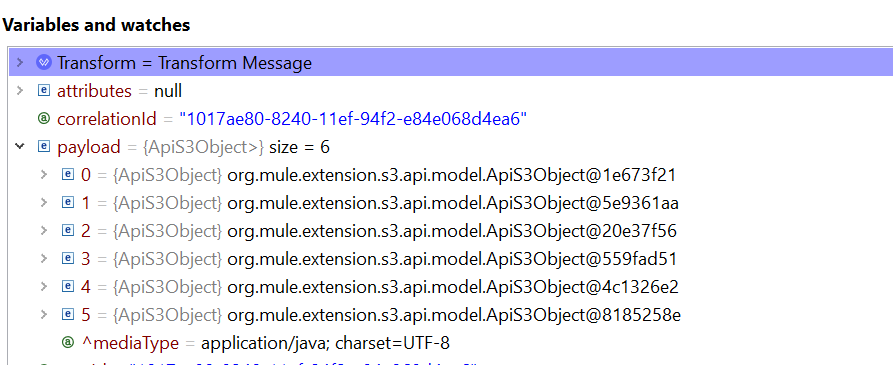 - List Objects Output While Debugging in MuleSoft: The output includes each object's Key, LastModified timestamp, ETag, Size, and Owner information.