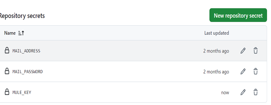 - Add the necessary secret values, such as your Mule environment variables, API keys, and SMTP credentials.