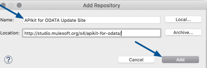 - In Name, type APIkit for ODATA v2 Update Site.