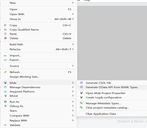 3. Now, right-click on the odata.raml file and select Mule > Generate OData API from RAML Types.