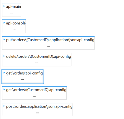The api.raml file will be generated based on the odata.raml file. This file contains the flows for interacting with the Order resource as shown below. The flows will handle GET, POST, PUT, and DELETE requests.