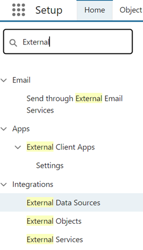 - In the Quick Find search box on the left, type External Data Sources and click on the External Data Sources option under the Integration section.