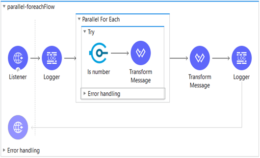 Like the For-each scope, the Parallel For-each scope also splits the collection of messages into elements. But, unlike the For-each scope, it processes each element simultaneously in separate routes and the result is the collection of all messages aggregated in the same sequence they were before the split.