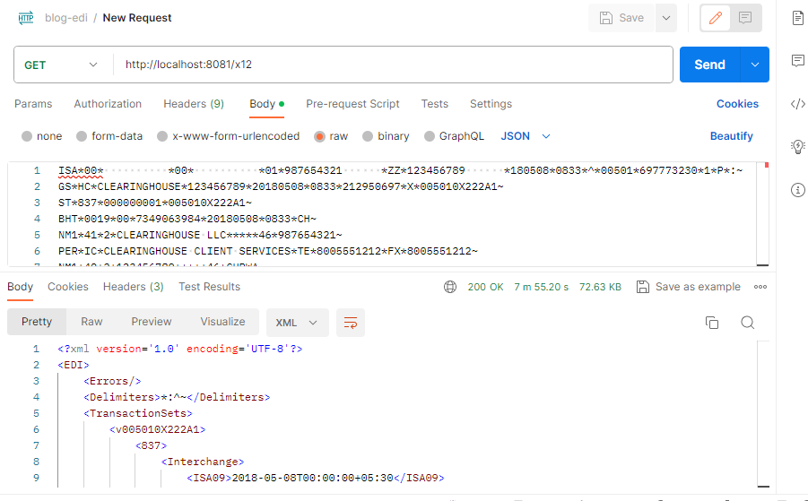 - The screenshot below shows the input EDI and output XML after it is transformed.