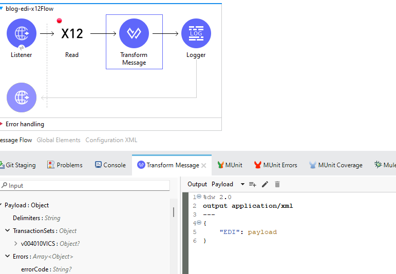 - Using a Transform Message processor, as seen above, the object is converted into XML format. In general, the output of X12-Read may be transformed into any other data format (e.g., JSON) that the application must work with.