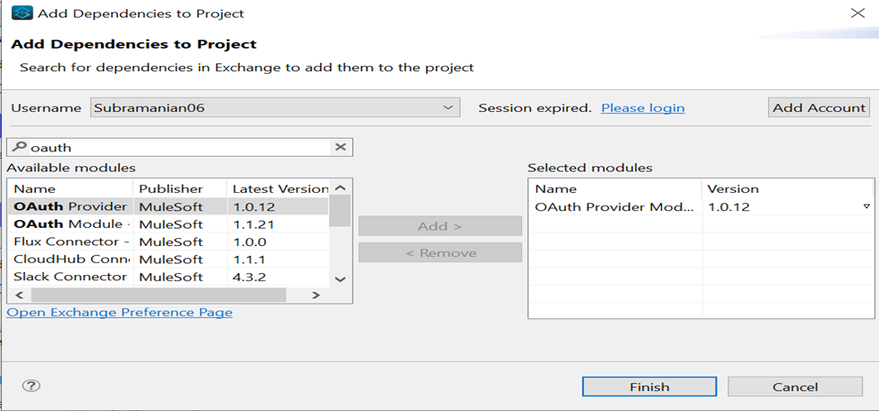 - Search and add OAuth 2.0 provider module from Anypoint Exchange.