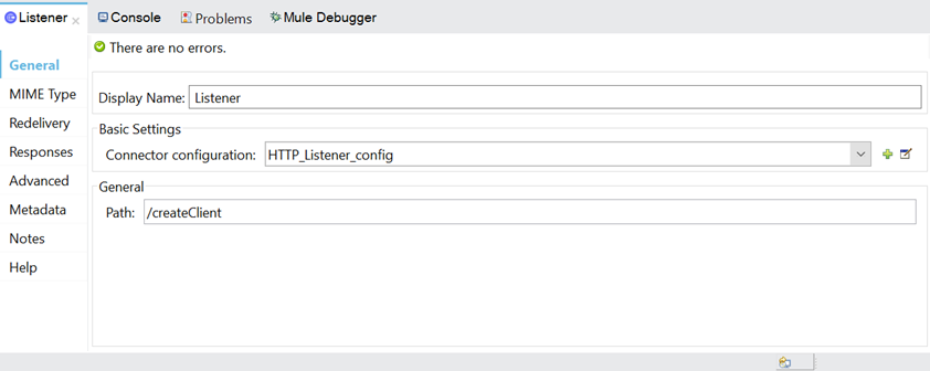 - Configure HTTP Listener Global configuration with default values and set path as /createClient.