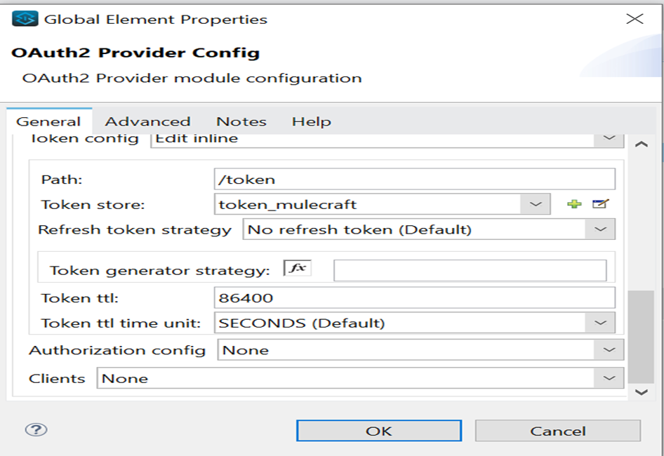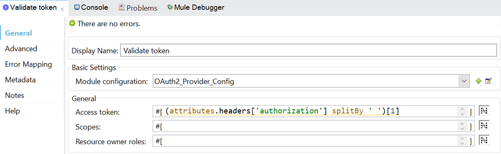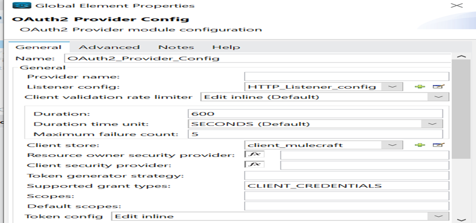 - Listener config: HTTP listener configuration through which Mule OAuth 2.0 provider is listening.