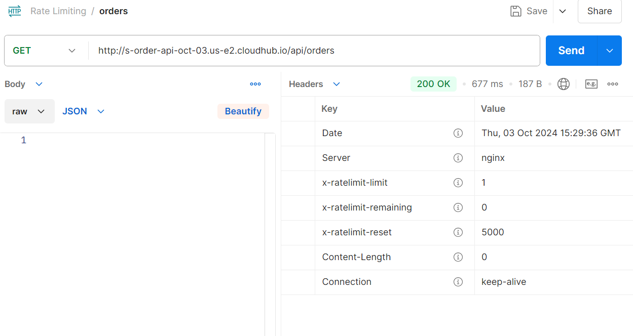 However, within a single sliding window of 5000 milliseconds, only one request can be fulfilled at a time. If I send two requests during this time, the first request will be processed, while the second request will be queued and will wait for the end of the time window. This queued request will be retried after 3000 milliseconds. If the time window elapses and the request has not been fulfilled, it will be processed at that time. If it does not get processed after the 3000 milliseconds, the request will be rejected, and an error will be returned.