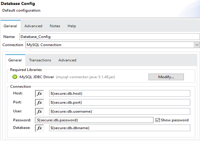 <db:my-sql-connection host="${secure::db.host}" port="${secure::db.port}" user="${secure::db.username}" database="${secure::db.dbname}" password="${secure::db.password}"/>
