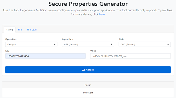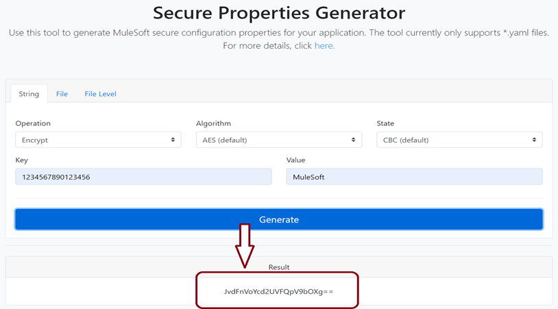 MuleSoft has optimized the complete process by providing an online secure properties generator that gives developers ease of securing properties. MuleSoft developers can now secure the properties in a point and click environment eliminating the command line interface.