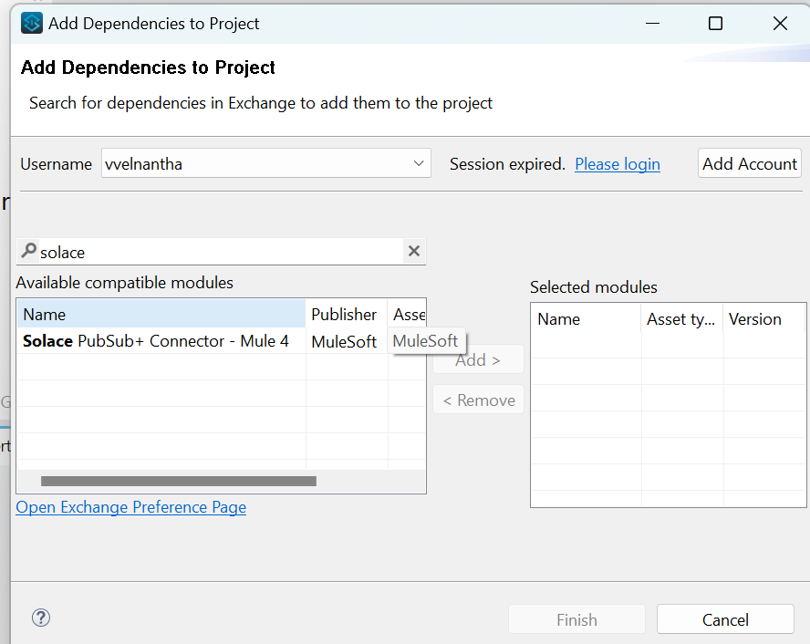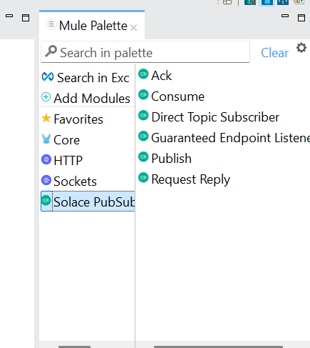 Using Anypoint Studio GUI(Add dependencies to project) - From the Mule Palette, select the first option. “Search in exchange” a window pops out; type “solace". Add the connector from available modules to selected modules and give "finish”.
