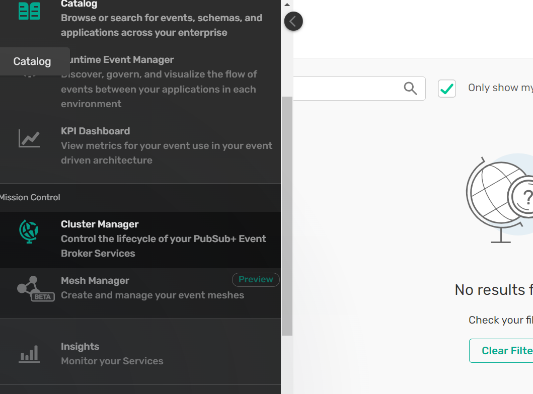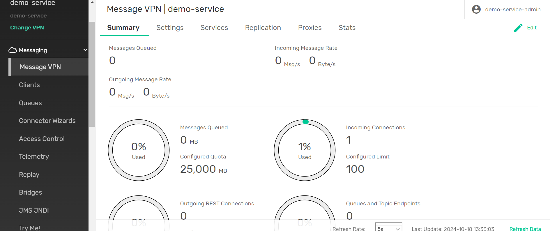 Let's create a queue and topic. Navigate to 'manage' and click 'Message VPN' which is under 'PubSub+ Broker Manager Quick Settings'. Then it will take you to the page of message service.