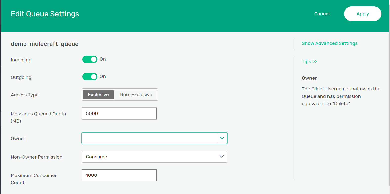 Once we provide a queue name and leave the default values, we should click 'apply'.